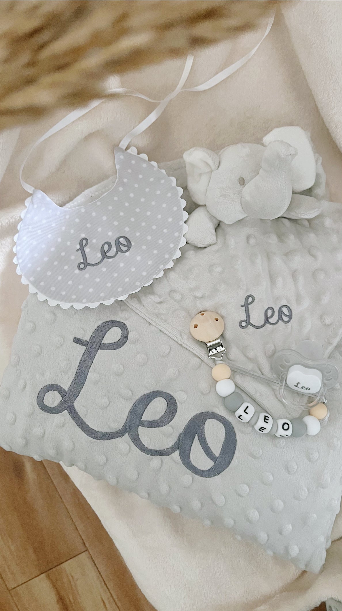 Exclusiva caja premium, perfecta para dar la bienvenida a un nuevo bebé. Un conjunto de básicos que incluye un adorable chupetero en tono beige y azul, un suave babero de piqué, una gran manta cálida personalizada (80x110 cm), un doudou de oso bordado y un chupete personalizado, todo en un bonito tono azul pastel.