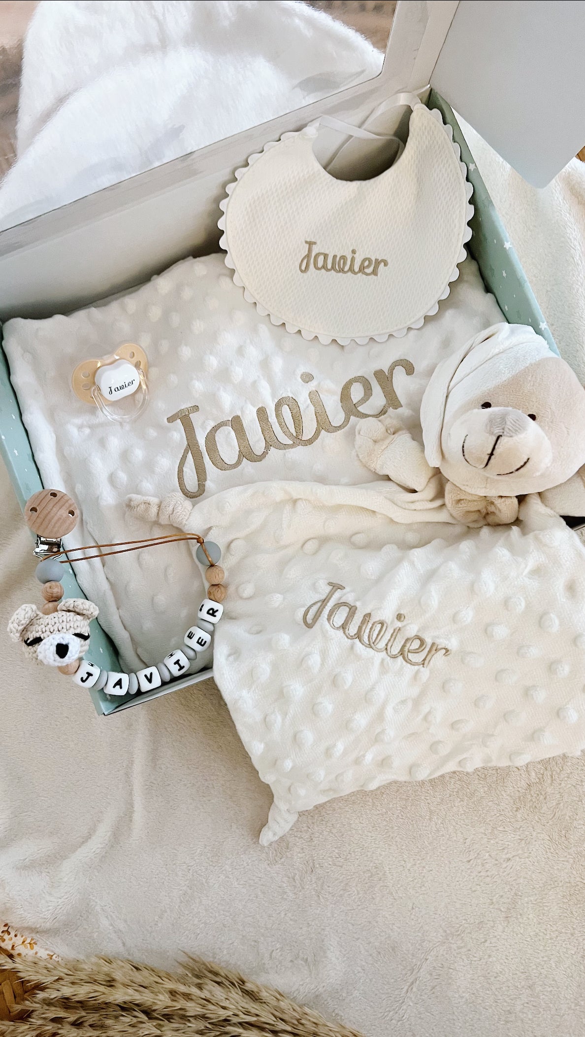 Exclusiva caja premium, perfecta para dar la bienvenida a un nuevo bebé. Un conjunto de básicos que incluye un adorable chupetero de oso de crochet en tonos beige, un suave babero de piqué, una gran manta cálida personalizada (80x110 cm), un doudou de oso bordado y un chupete personalizado, todo en un bonito tono beige.