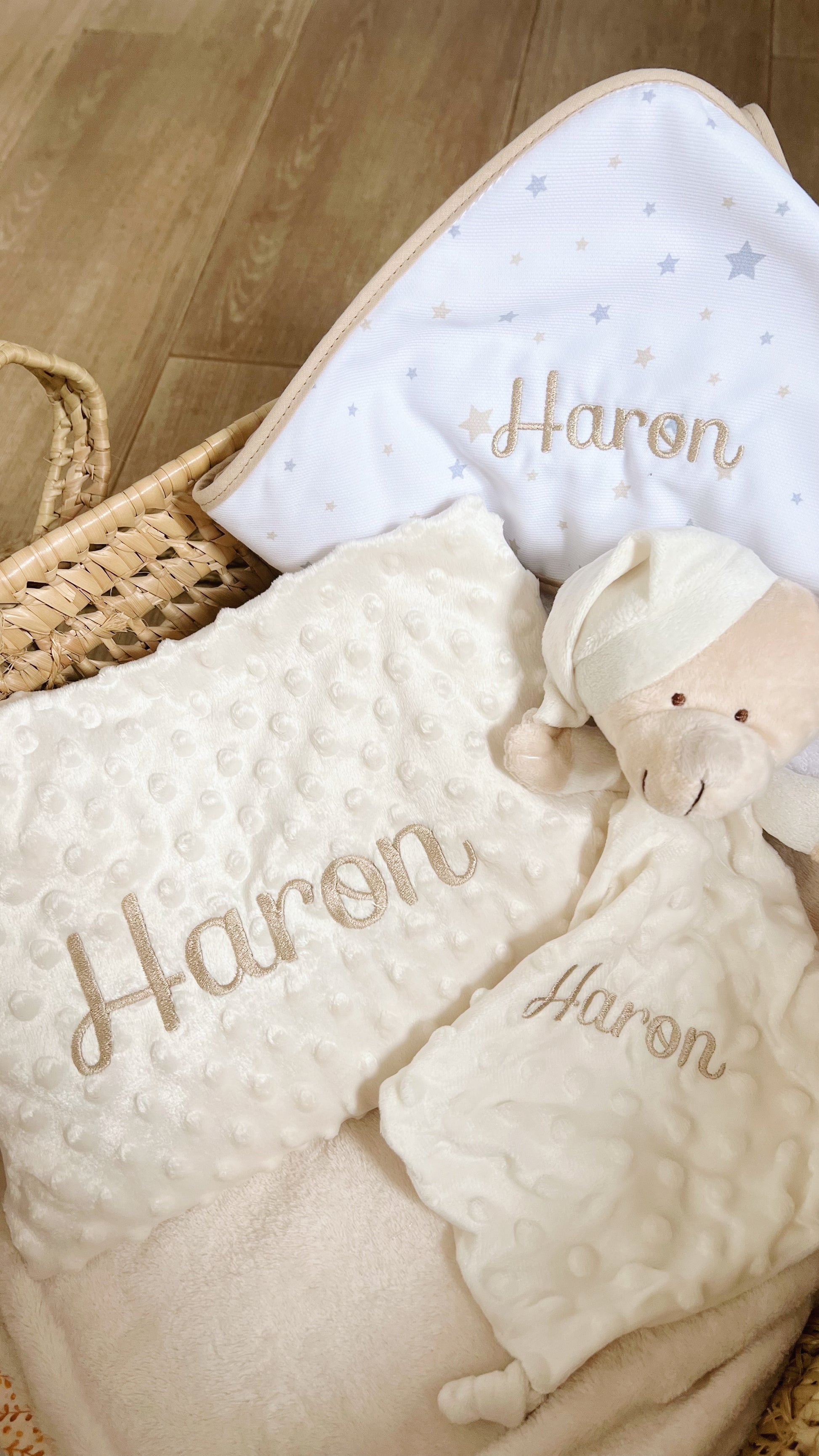 Suave manta con el nombre bordado. De tacto aterciopelado y extrasuave, con unas medidas de 80x110cm. Peso aproximado de la manta: 380 gr/m2